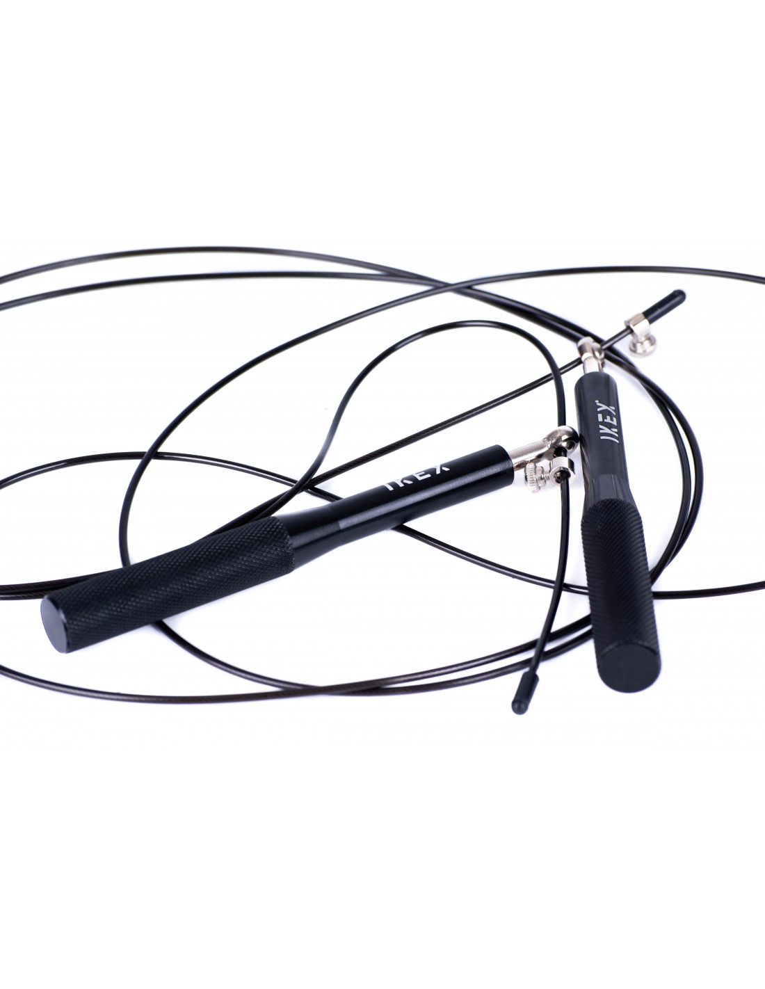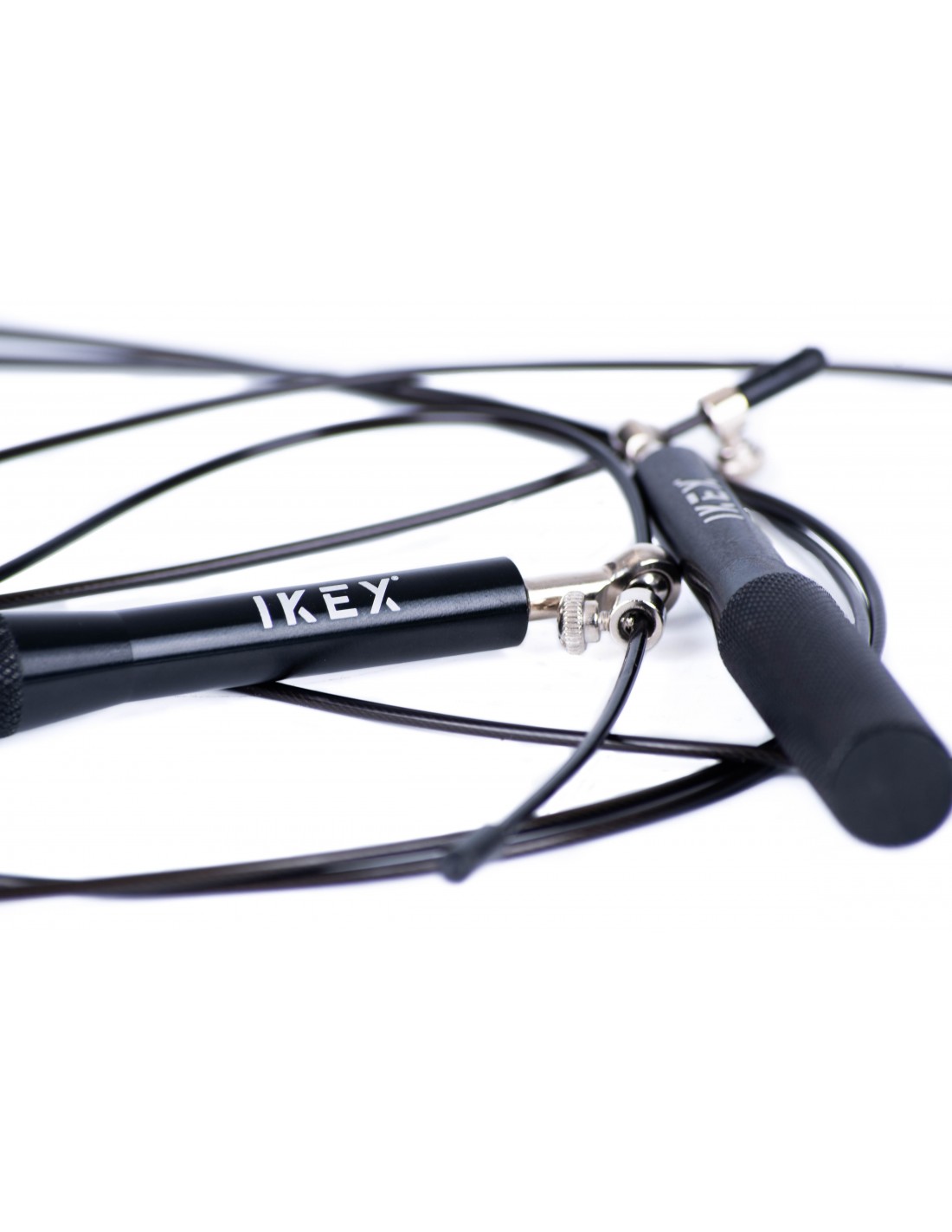 Comba profesional de alta velocidad IKEX fabricada con mangos de aluminio anodizado y cable de acero trenzado recubierto en PVC. Diseñada para dominar los double unders, entrenamientos HIIT y soportar el uso intensivo en boxes de entrenamiento funcional.